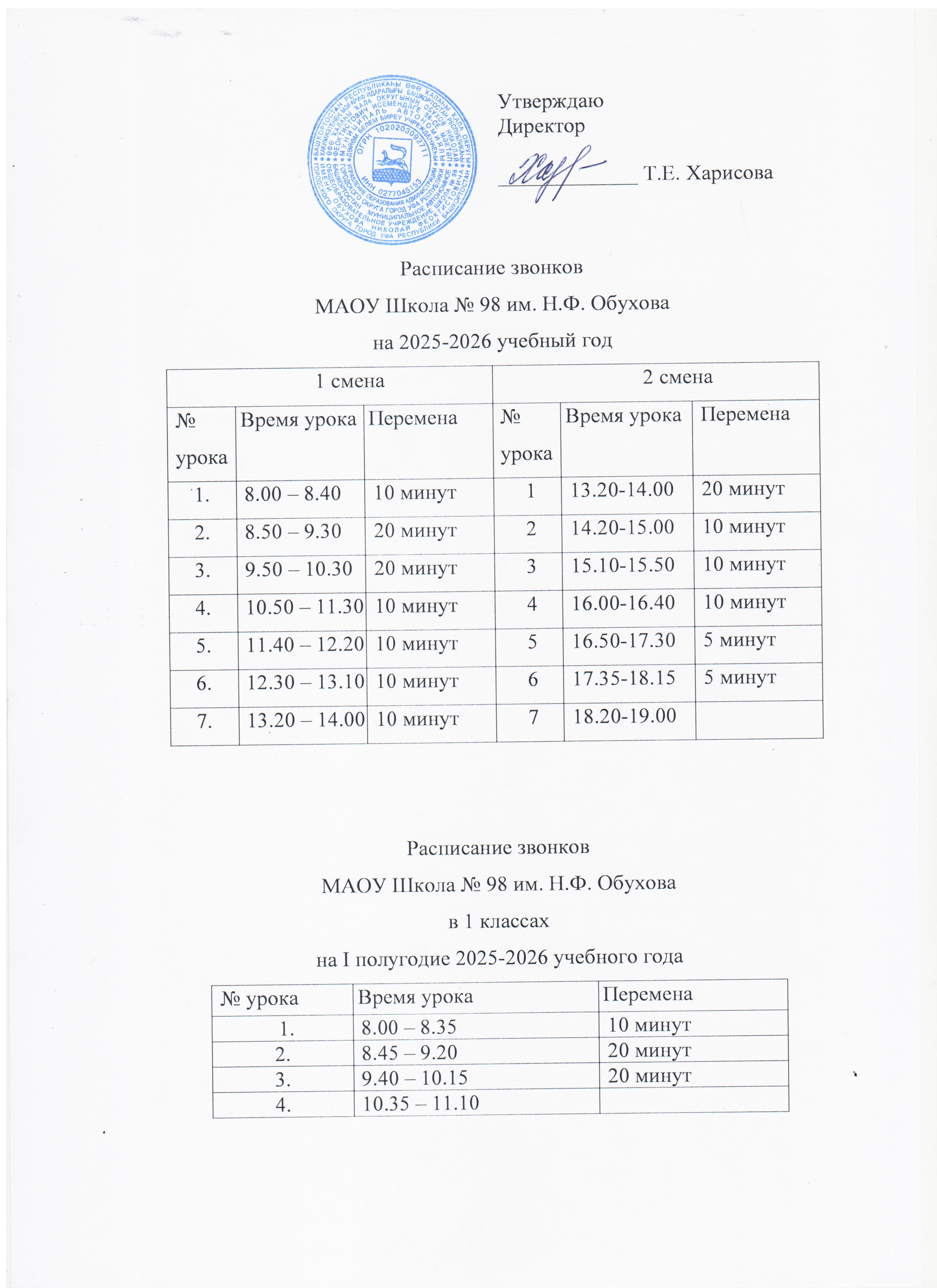 Расписание звонков 1 классов на 1 полугодие 2025 - 2026 учебный год
