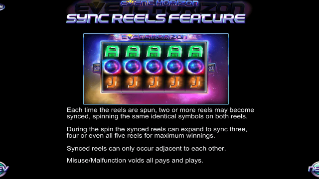 Единственная бонусная опция видеослота носит название «Синхронизация барабанов». Суть ее заключается в том, что соседние барабаны содержат идентичные символы. Опция действует в каждом спине. Синхронизироваться одновременно способны два, три, четыре, пять барабанов. Наличие этой опции значительно повышает шансы гэмблеров на выигрыш. Пользователь убедится в этом, сыграв в игру Горизонт Событий в деморежиме.