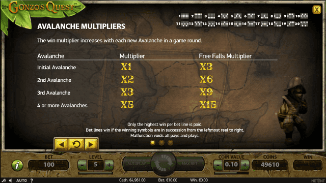 После появления на экране призовой цепочки активируется функция «Avalanche». Выигравшие иконки взорвутся и испарятся. На их месте лавинообразно возникнут изображения, формируя новые комбинации.
